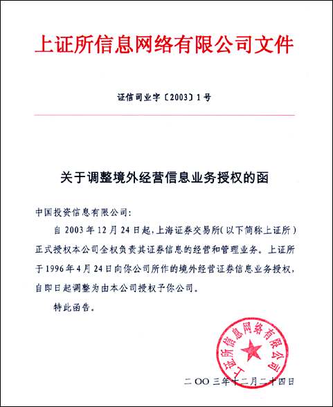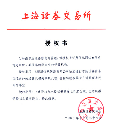 二、上海證券交易所、深圳證券交易所分別于2003年12月24日、1998年6 月12日授權(quán)上證所信息網(wǎng)絡(luò)有限公司、深圳證券信息有限公司為各自證券信息的獨(dú)家全權(quán)經(jīng)營機(jī)構(gòu),上海證券交易所、深圳證券交易所對其他有關(guān)機(jī)構(gòu)經(jīng)營證券信息的所有授權(quán)均已到期,宣告終止。